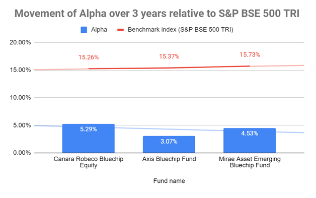 Here, we have taken a few funds from our recommended list, to see how Alpha has moved relative to its benchmark i.e S&P BSE TRI.